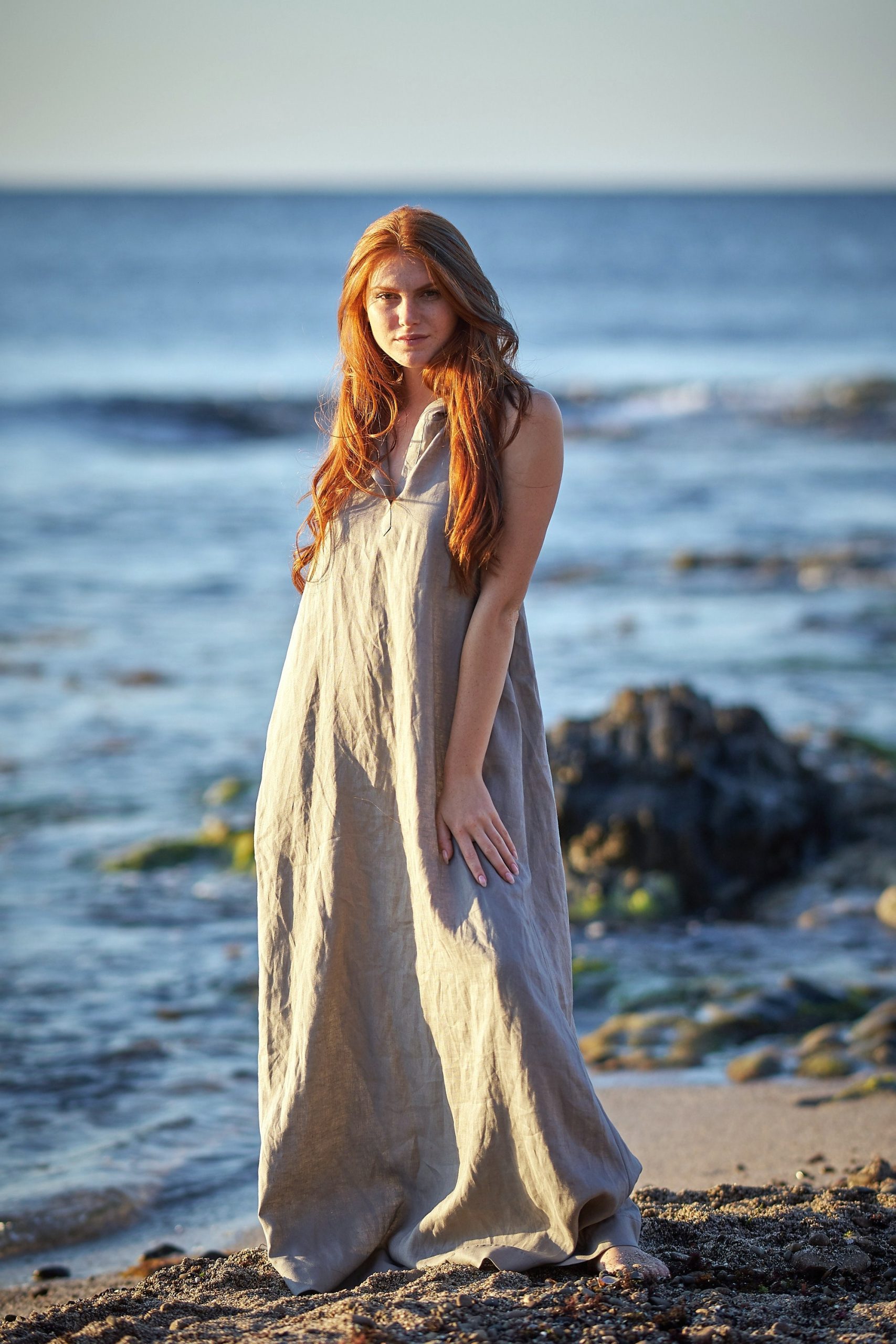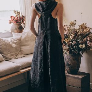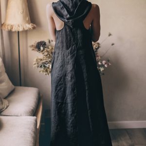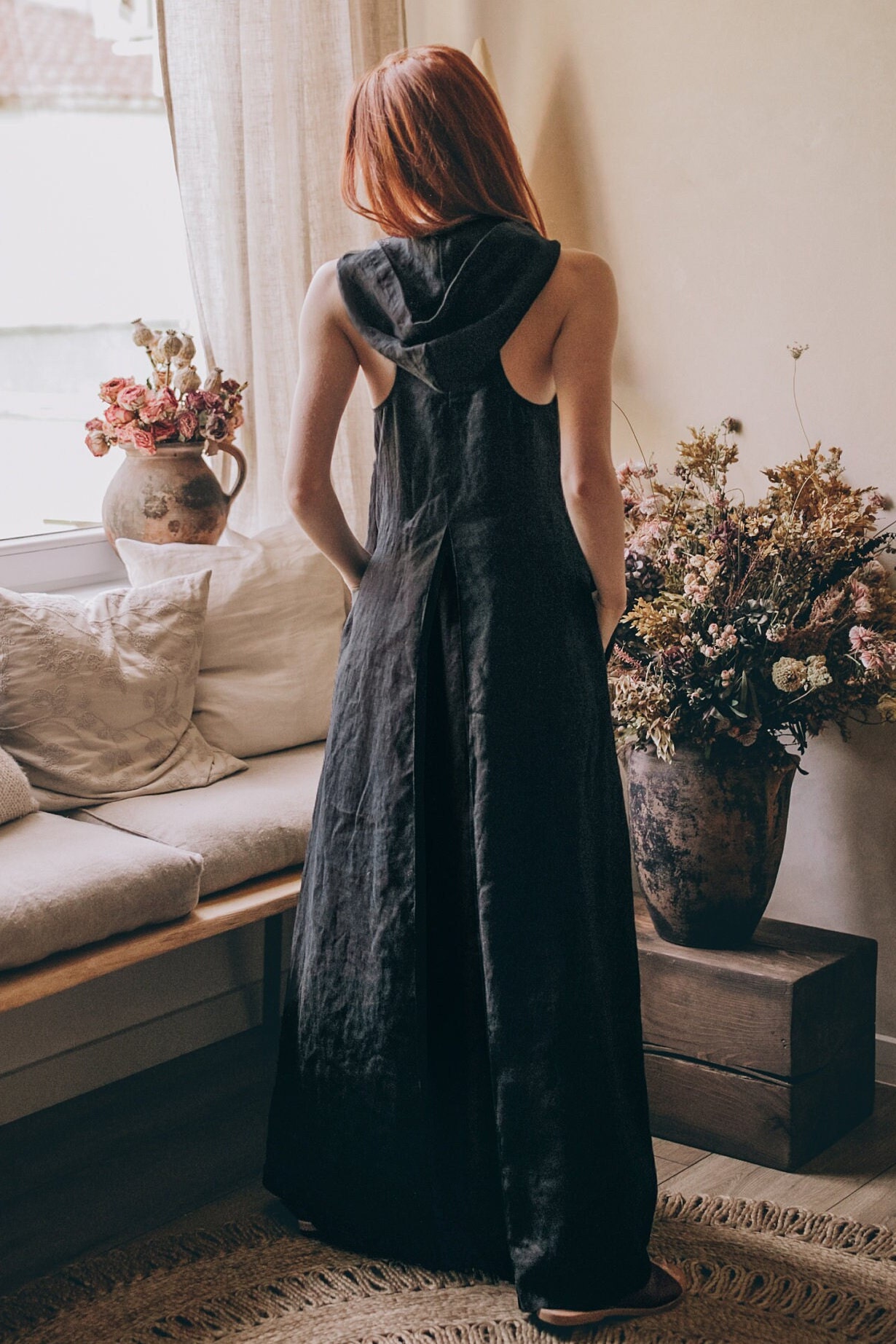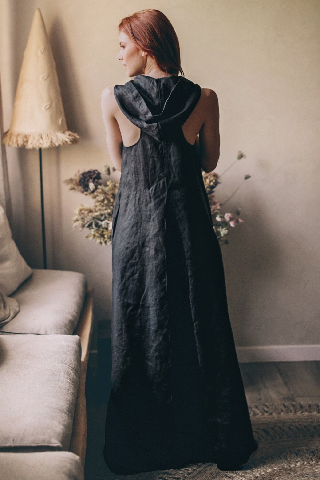 Dusty Turquoise Linen Dress Maxi Hooded Boho For