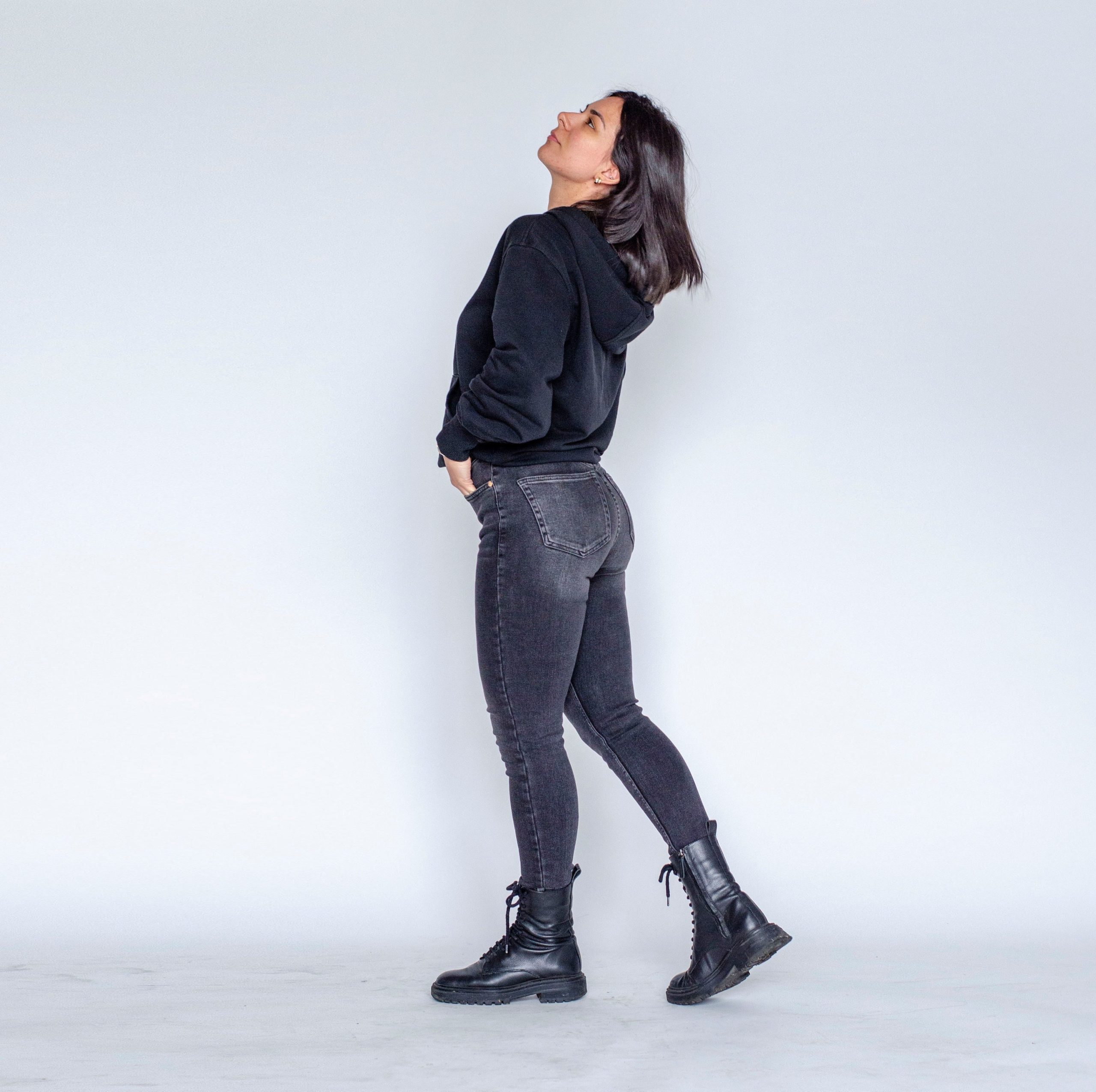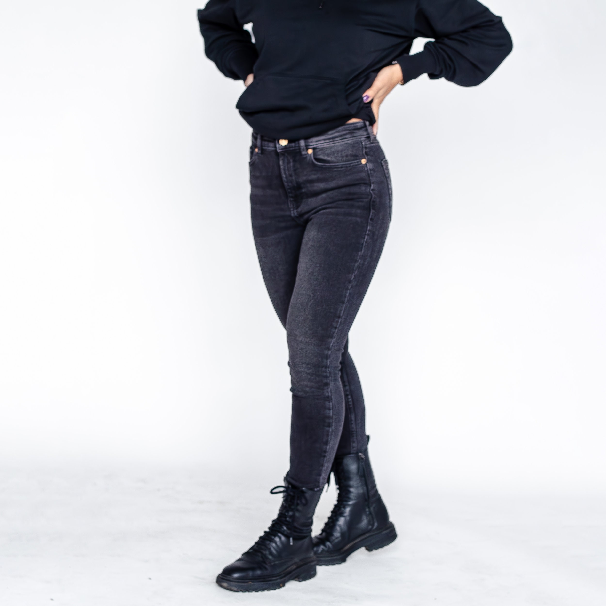 These high-waisted black skinny jeans are the perfect addition to your wardrobe for a trendy and edgy look. The acid wash finish gives them a unique, dark grey marbled appearance, while the high-rise fit and stretchy denim fabric provide a comfortable and flattering silhouette.